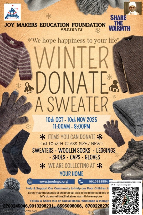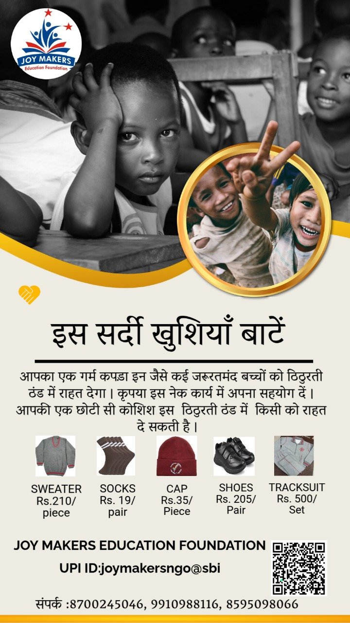 प्रिय साथियों 🙏, शिक्षा ही वह रोशनी है जो अंधकार मिटाती है, और वही हमारे बच्चों के बेहतर भविष्य की कुंजी है। " जॉय मेकर्स एजुकेशन फाउंडेशन " का उद्देश्य है — हर उस प्रतिभाशाली बच्चे तक शिक्षा और अवसर पहुँचाना, जो आर्थिक तंगी के कारण अपने सपनों से दूर हो जाता है। इस वर्ष जॉय मेकर्स एजुकेशन फाउंडेशन ने संकल्प लिया है कि ठंड के मौसम में 1000 जरूरतमंद बच्चों को गर्म यूनिफ़ॉर्म जैसे स्वेटर, टोपी, पजामी, मोज़े,जूते आदि उपलब्ध कराई जाएगी, ताकि कोई भी बच्चा ठंड की वजह से स्कूल जाने से वंचित न रहे। ❄️🎒